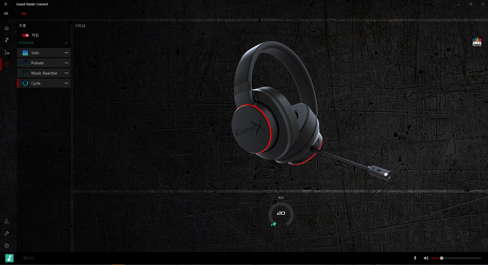 조명은 단색인 Solo, 숨쉬기 모드인 Pulsate, 소리에 따라 반응하는 Music Reactive, 여러 색이 돌아가는 Cycle 모드가 있습니다.