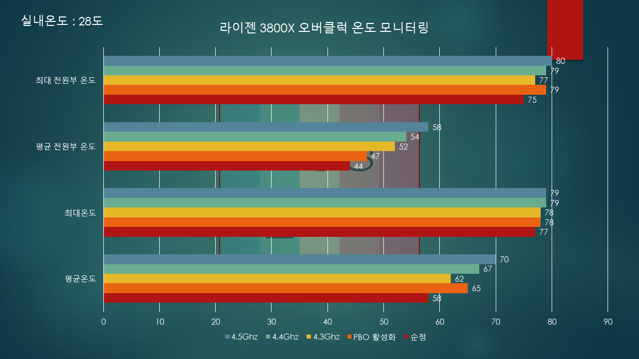 먼저 단순 자료해석을 하자면, 클럭이 높을수록 온도가 비례해서 높아지는걸 볼 수 있는데, 한가지 흥미로운점은 순정과 PBO간의 온도차이입니다.