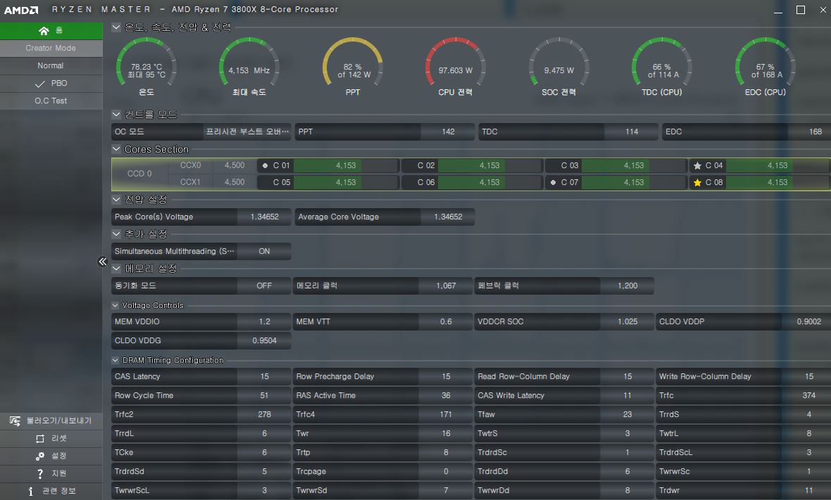 그런데 한가지 이상한점이 있다면, Ryzen Master 상에서 기본값 / PBO 사이간에 무언가 존재하는것 같습니다.