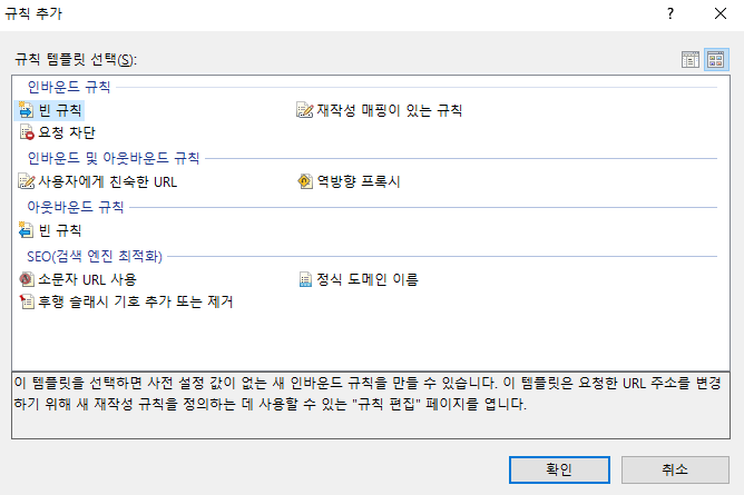 URL 재작성 2.0 왼쪽의 추가 버튼을 누르고, 오른쪽 하단 설치버튼을 눌러 설치합니다.