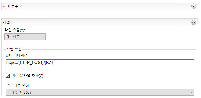 마지막 작업 탭에서 작업 유형 = 리디렉션, 작업 속성 안에 URL 리디렉션은 다음과 같이 적습니다.