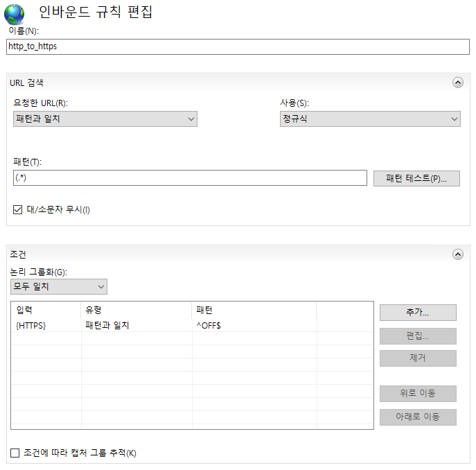 조건 탭은 추가 버튼을 눌러 입력 = {HTTPS} 유형 = 패턴과 일치, 패턴 = ^OFF$ 를 입력해줍니다.