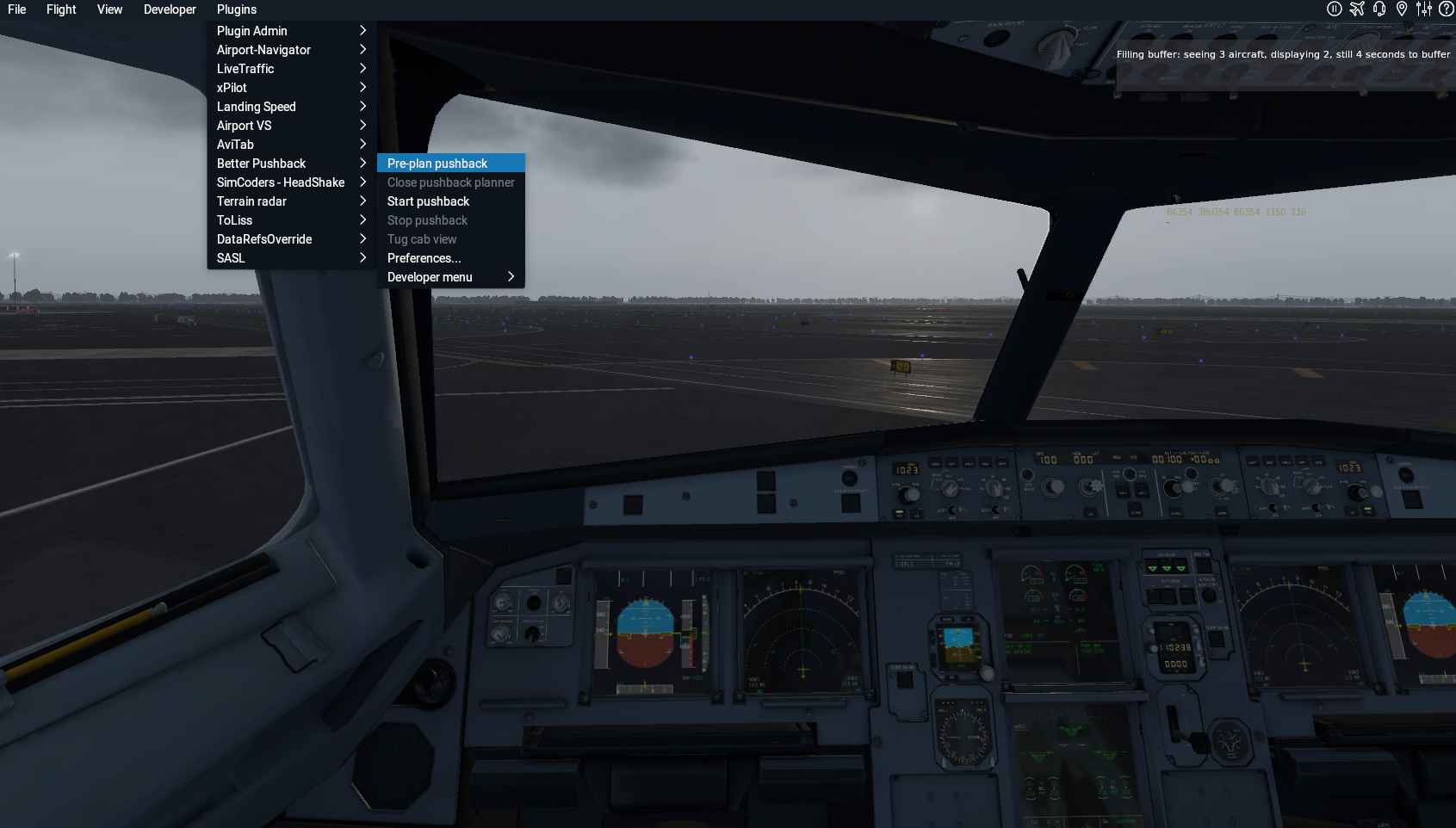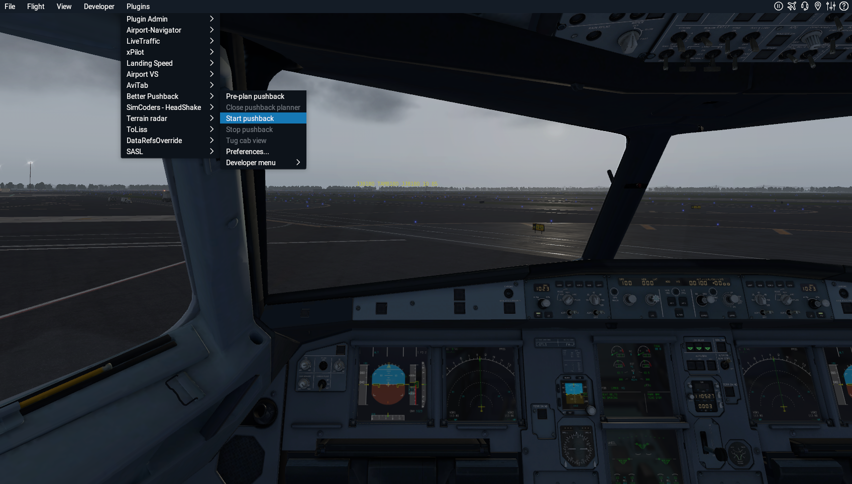 이후 X plane을 실행시키면, Pushback을 플러그인을 통해 할 수 있습니다.