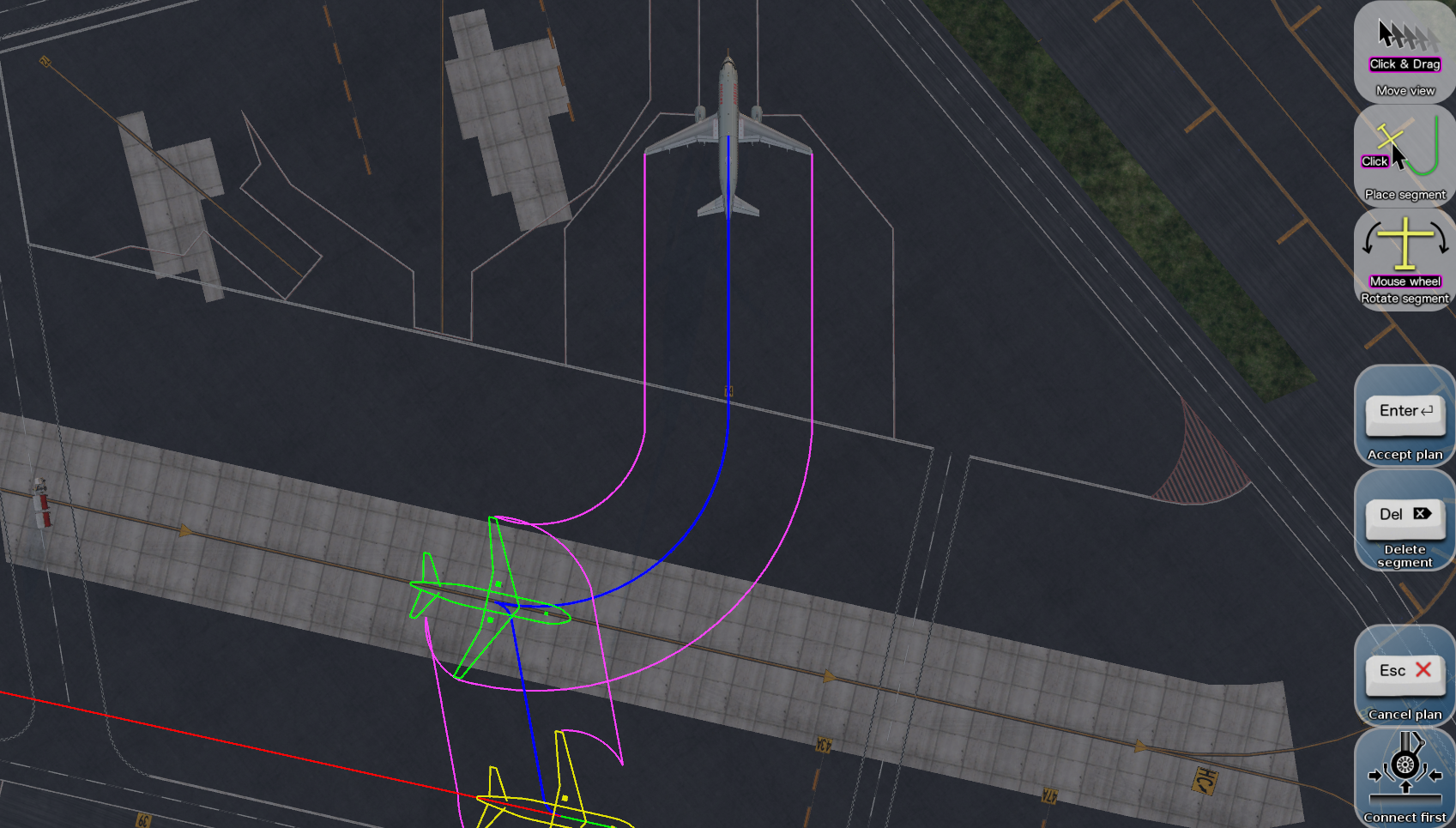 기존 X plane에서는 키를 바인딩하여 3인칭 시점에서 직접 돌려야하는데, 이 플러그인을 사용하면 상단 시점에서 푸쉬백 경로를 시각적으로 지정하고, 수행할 수 있습니다.