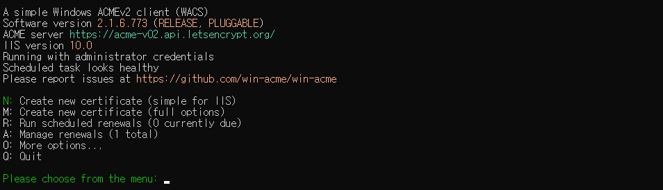 아래 win-acme 접두사로 시작하는것들은 윈도우즈 서버상에서 사용할 수 있습니다.