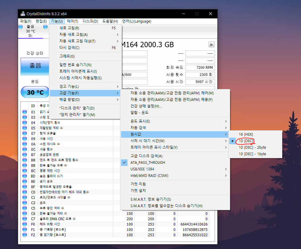 먼저 스샷은 제가 사용중인 하드디스크 중 하나입니다. 표준적인 하드디스크라면 딱 이정도의 항목이 뜰겁니다.