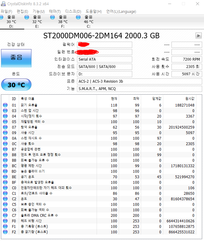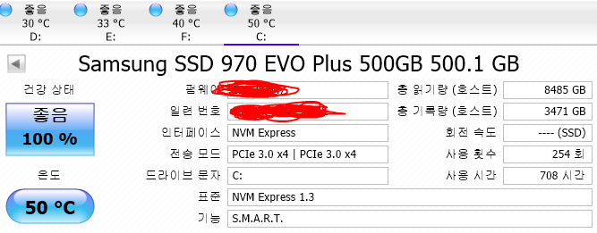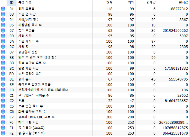 요즘은 S.M.A.R.T 가 많이 좋아서 자체적으로 ~~수명으로 수명이 뜨기도 하고, 사실 경고 뜬거만 보면 됩니다.