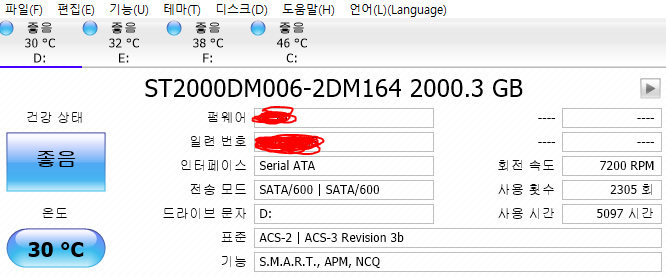 먼저 스샷은 제가 사용중인 하드디스크 중 하나입니다. 표준적인 하드디스크라면 딱 이정도의 항목이 뜰겁니다.