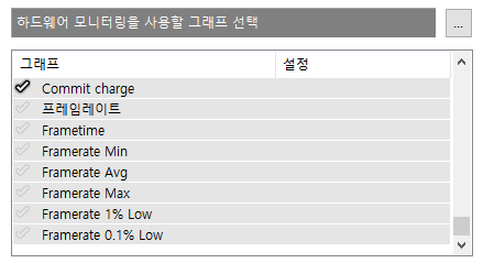 중간의 그래프 탭은, 표시할 항목들이 나와있는 탭입니다. 제일 아래로 내리시면 프레임과 최소 / 최대 / 평균 프레임을 확인할 수 있으며, 1% low와 0.1% low 역시 확인할 수 있으므로 왼쪽의 체크표시를 해서 활용하시면 좋습니다.