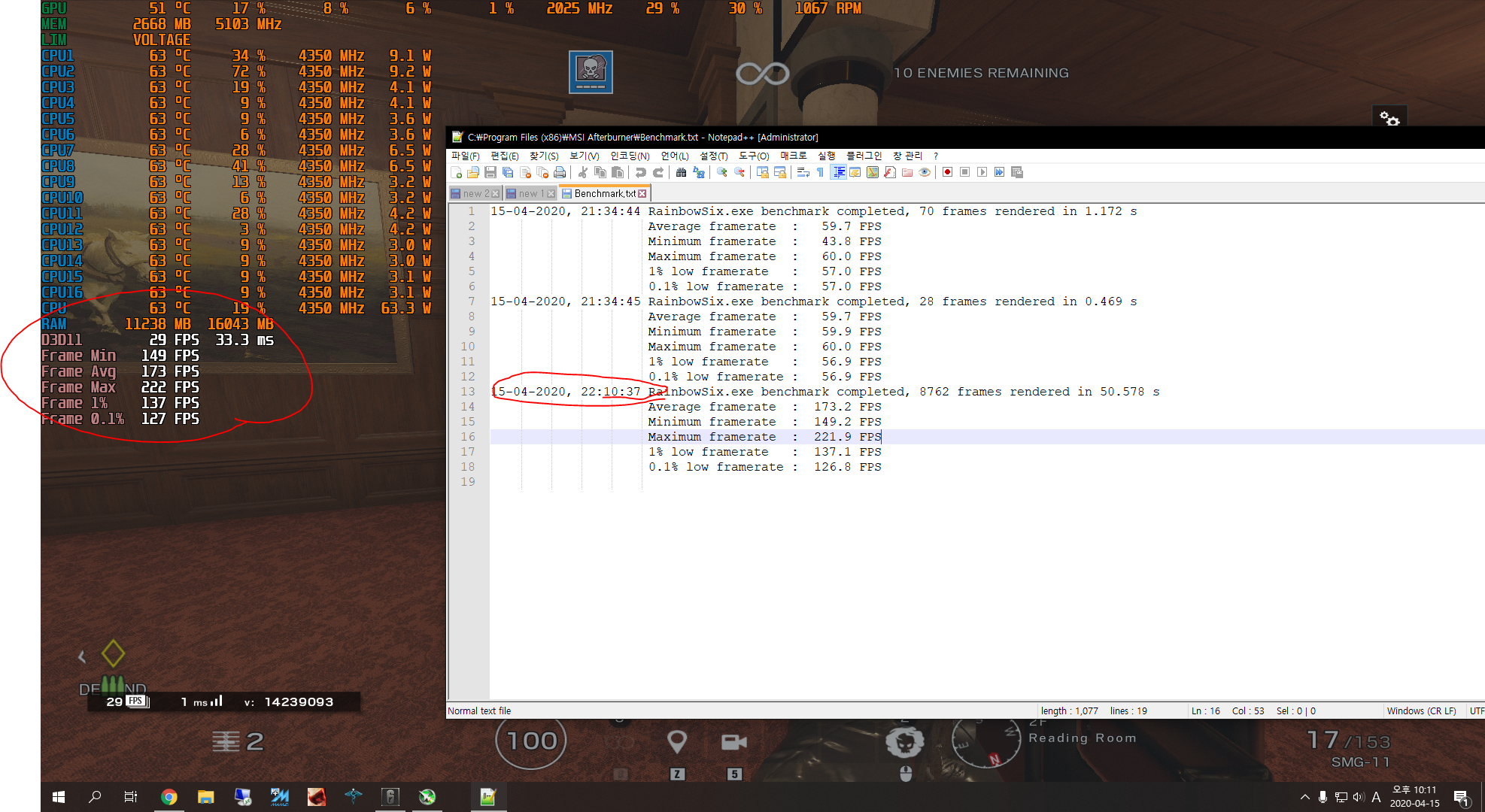 이제 우리가 원하는 탭이 나왔습니다! 모든 CPU 사용량 / GPU 사용량 / 램 사용량 / 온도 및 전력, 프레임 최소 최대까지 모두 나오네요.