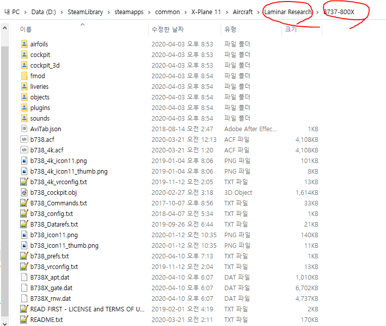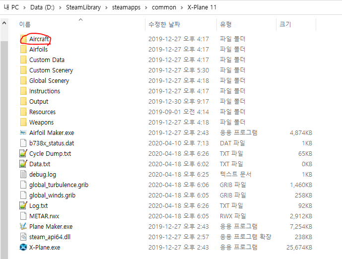 이런식으로 설치 폴더가 보이면, 먼저 Aircraft 폴더에 갑니다.