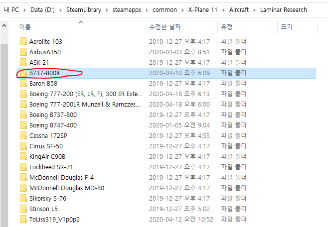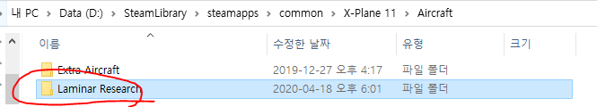 다음은 Laminar Research 폴더로 갑니다. 여기에 넣으셔야 제일 위에 항공기가 바로 뜹니다.