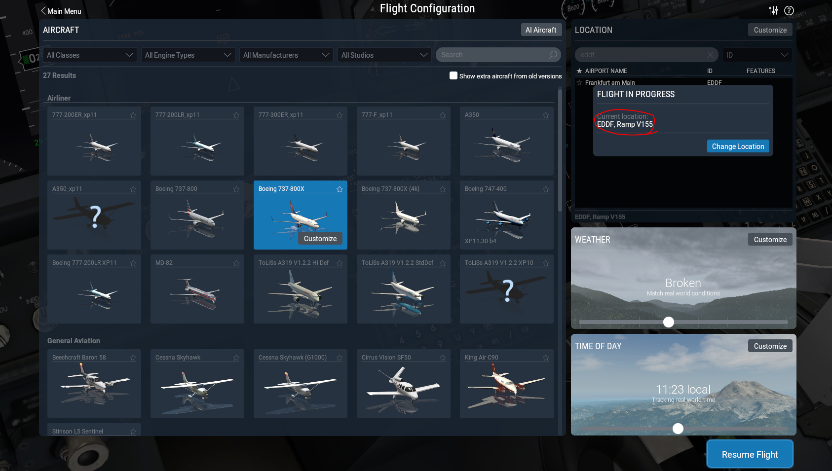 Current Location 항목의 ICAO 코드와 Ramp 위치를 보시면 됩니다.