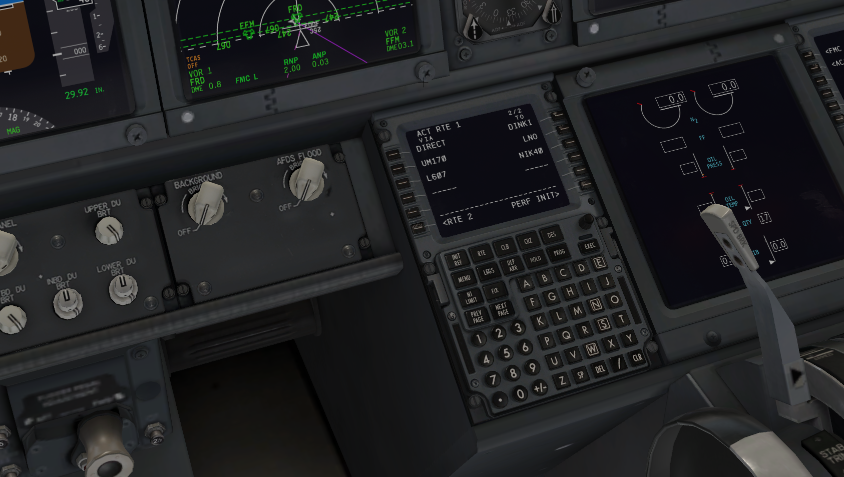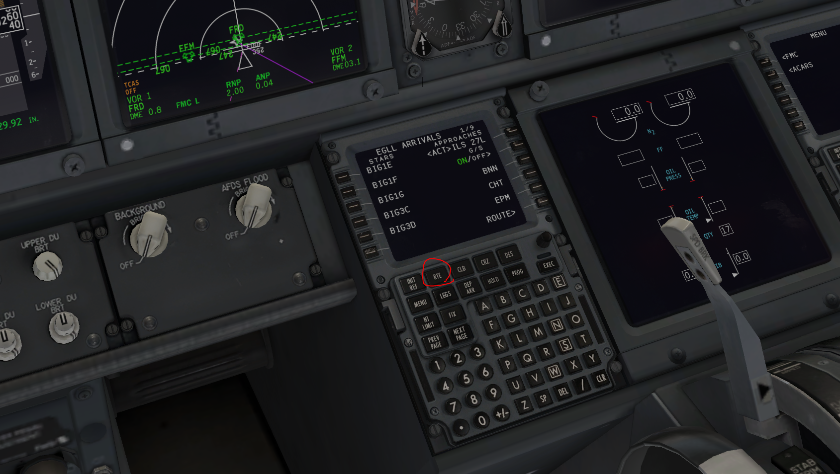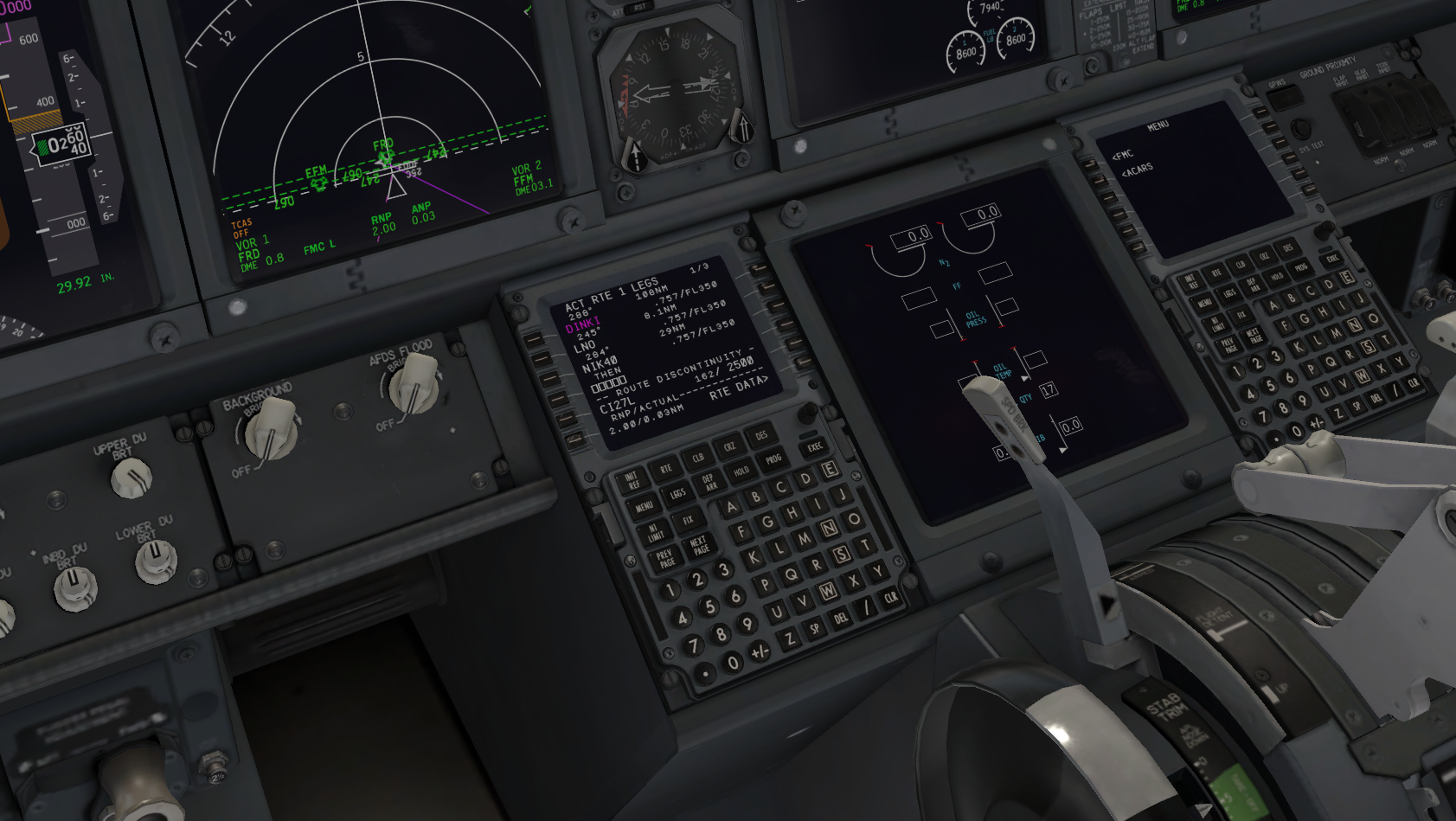 ND 위에 있는 원안의 버튼을 오른쪽으로 돌려, PLN항목으로 돌려주면, 항공기에 입력된 항로를 확인할 수 있습니다.